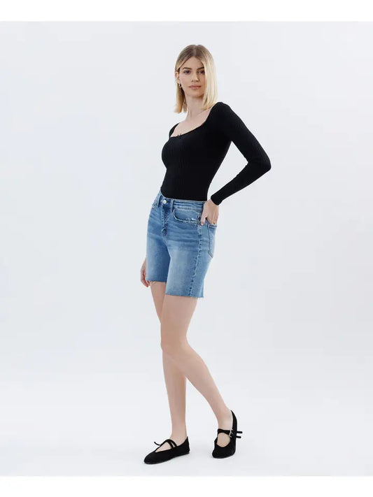 Ambition High Rise Raw Hem Vervet Bermuda Shorts