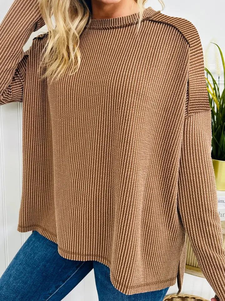 Stylish twist ribbed fabric is textured and comfy. Exposed seam detail for trendy casual wear. Perfect layering top.