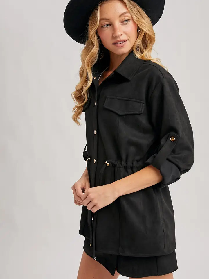 It features a collar, button-down front, and two flap pockets on the chest. The sleeves are long and rolled up, secured with tabs and gold-toned buttons. The jacket has a relaxed fit and is made of a soft, suede-like material. It also has a drawstring detail at the waist, cinching it slightly.